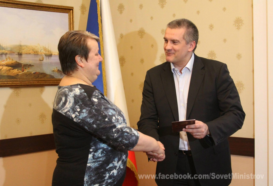 Паспорт Аксьонову вручила заступник керівника Федеральної міграційної служби Росії Олена Родочіна. Російські паспорти у Криму також почали видавати всім охочим жителям півострова.