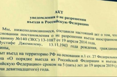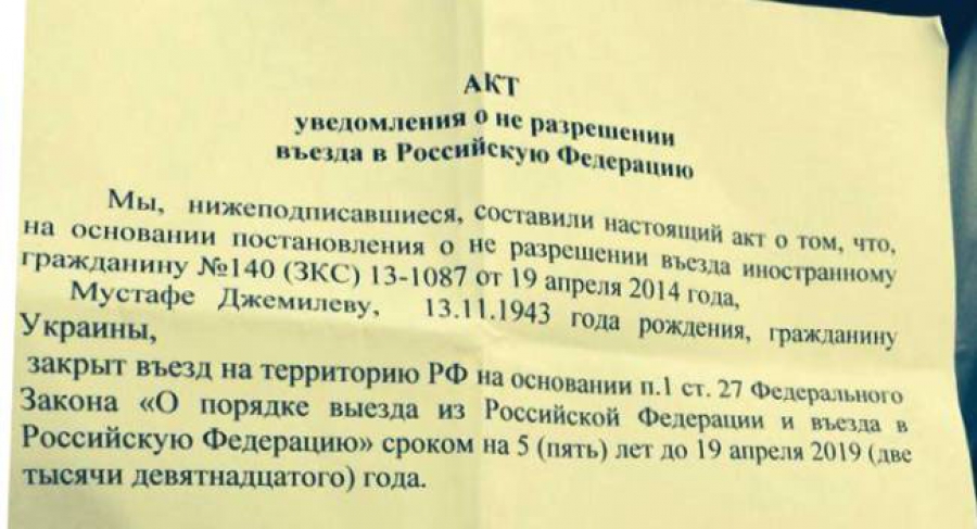 "Ми, нижчепідписані, склали цей акт про те, що, на підставі постанови про недозвіл в`їзду іноземному громадянину №140 (ЗКС) 13-1087 від 19 квітня 2014 року, Мустафі Джемілєву 13.11.1943 року народження, громадянину України, закрито в`їзд на територію РФ на підставі п.1. ст. 27 Федерального закону "Про порядок виїзду з Російської Федерації та в`їзду до Російської Федерації" строком на 5 (п`ять) років до 19 квітня 2019 року", - говориться у цьому акті.