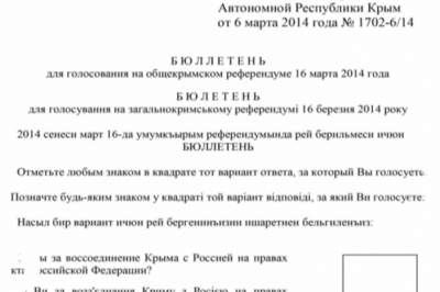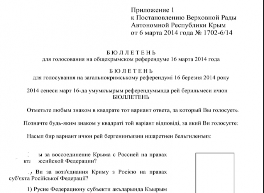 У документі - два запитання - російською, українською та кримськотатарською мовами – «Чи підтримуєте ви приєднання Криму до Росії», а також «Чи ви за відновлення дії Конституції Криму 1992 року і за статус Криму, як частини України?».