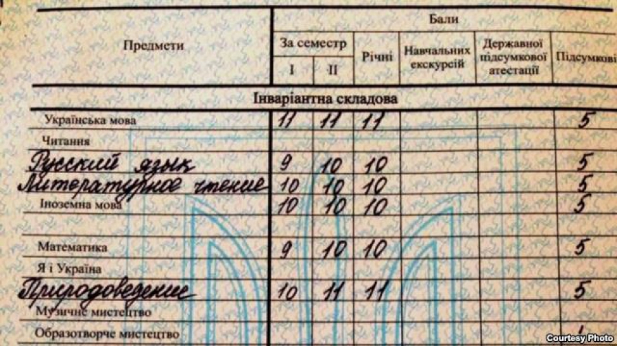 Відзначимо , що нові російські оцінки виставлені в табелі українського зразка з водяним знаком у вигляді тризуба .