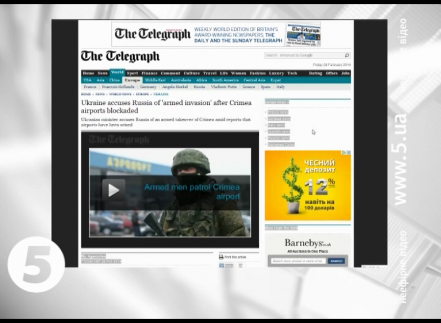 «Російські війська захопили аеропорти Криму» – саме такі заголовки превалюють у іноземних ЗМІ в п’ятницю. Більшість видань висвітлюють позицію нової української влади, яка звинувачує Москву у збройному вторгненні на територію України. Вражаючі фото попередніх тижнів – із палаючим Києвом – на перших шпальтах замінили світлини кримських міст із озброєними людьми у формі без розпізнавальних знаків.