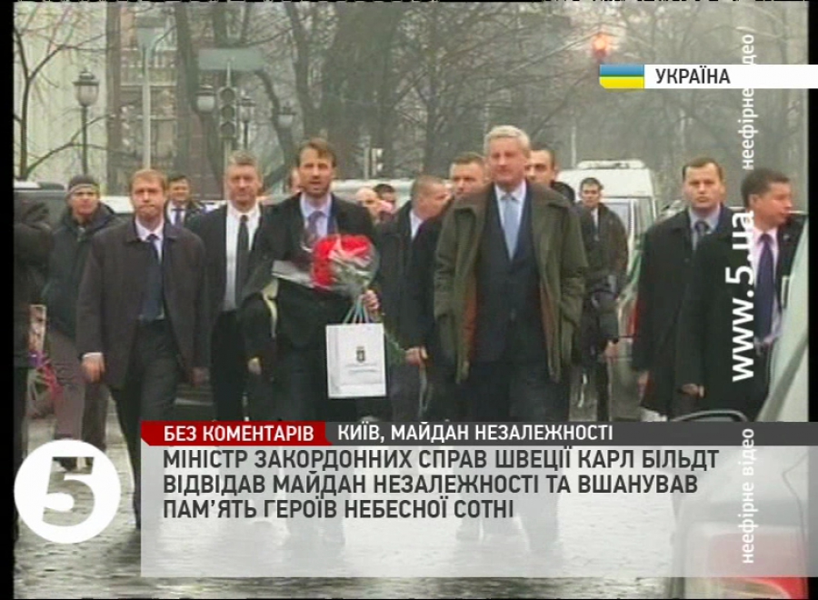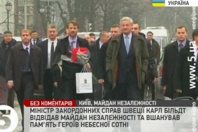 Багато фотографував, робив нотатки й обговорював те, що бачить із послом Швеції в Україні. Більдт зізнався, що не упізнає Майдан Незалежності, який тепер більше схожий на поле битви. Тих, хто загинув, міністр назвав могутніми людьми, на яких Україна має рівнятися. Журналістам він розповів, що прибув до Києва, щоб поспілкуватися з урядовцями. І з’ясувати, яка підтримка потрібна зараз Україні, особливо під час російської агресії. За словами Карла Більдта, щодо фінансової допомоги спільно радитимуться країни-члени ЄС. Чільник МЗС Швеції не виключив: якщо Україна звернеться за підтримкою до НАТО, то може отримати й військову допомогу.