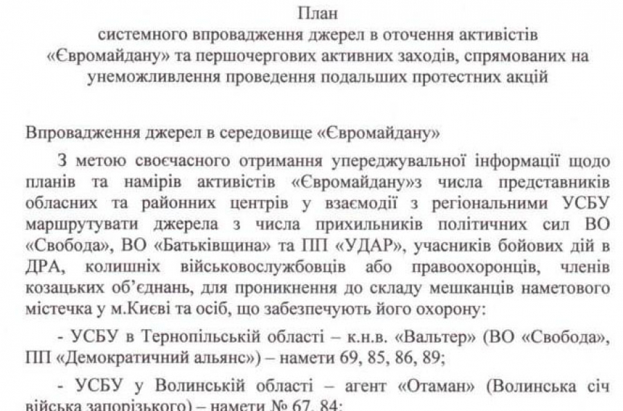 Народний депутат України Генадій Москаль розповсюдив чергову серію викривальних документів. Серед них план агентурно-оперативних заходів із нейтралізації Євромайдану, підготовлений СБУ. Згідно розповсюдженого плану, можна говорити, що в опозиційні партії та громадські організації впроваджені співробітники СБУ-нелегали. Крім того, агентура вербувалася з числа самих активістів “Батьківшина”, “УДАРу”, “Свободи” та громадських організацій. У разі, якщо нове керівництво СБУ не розкриє своїх сексотів, Москаль обіцяє опублікувати списки агентів із прізвищами та іншими даними сам Оприлюднені документи можна переглянути на сторінці Нагадаємо, раніше Геннадій Москаль оприлюднив частину планів спецоперацій «Хвиля» і «Бумеранг» згідно яких штурмувати Майдан мали 22 тисячі силовиків.