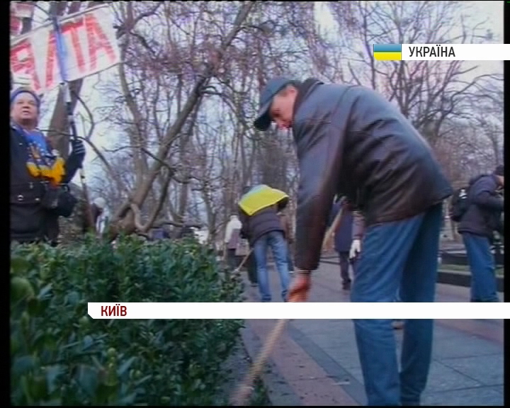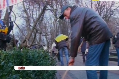Екологічну акцію організували добровольці. Завадити прибиранню мала намір міліція, яка оточила вхід у парк і намагалася перешкодити людям туди пройти. Однак, євромайданівці на чолі з нардепом Андрієм Парубієм прорвали кордон правоохоронців і позбирали бруд у пакети. Нагадаю, в неділю, 22 грудня, організатори безстрокової акції на підтримку "Партії регіонів" і Президента оголосили про її тимчасове призупинення. Учасники з-під стін Верховної Ради розійшлися, але лишили по собі купи сміття, поламані паркові ліхтарі та лавки.