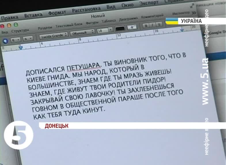 Тексти надходять у вигляді СМС з невідомих номерів, а також на Інтернет сторінки активістів і журналістів через соціальні мережі. Невідомий автор погрожує людям розправою над ними та їхніми родинами та звинувачує донеччан у тому, що відбувається у Києві. У текстах використовується чимало нецензурної лексики. Журналісти й активісти планують написати заяви до міліції. Самі правоохоронці поки відмовляються від коментарів.