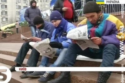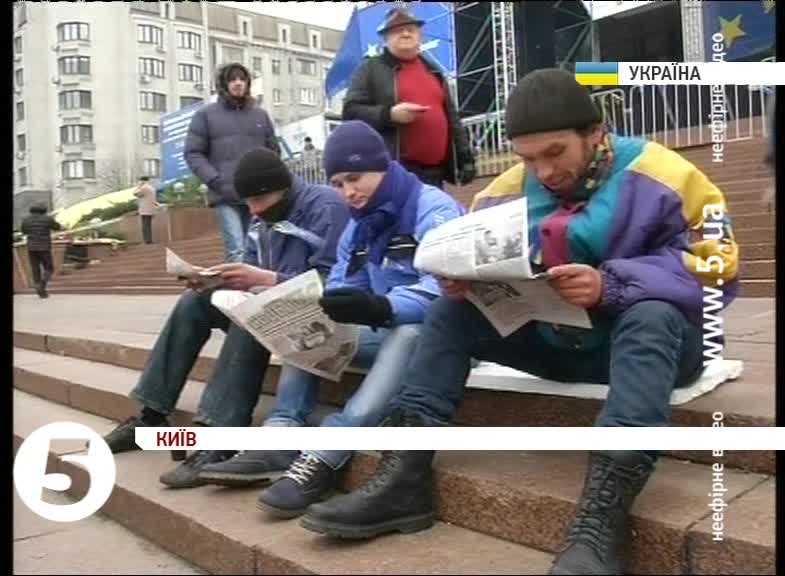Зранку всім охочим роздавали українську символіку. Підтримують активістів польовими кухнями - чай-каву варять просто на місці, пригощають випічкою. Учасники мітингу просять киян допомогти - їжею, теплим одягом. Самі ж тим часом розводять вогонь у металевих бочках. Очікують, що ввечері до них приєднаються мешканці столиці. Поки ж - більшість новоприбулих - з інших міст України.