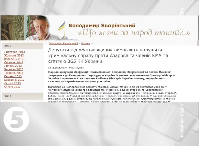 Із таким зверненням до Генпрокурора звернулися Володимир Яворівський та Василь Пазиняк. Опозиціонери переконані, розпорядженням про призупинення підготовки до євроасоціації України, Кабінет міністрів перевищив свої повноваження. Адже не вправі ухвалювати такі рішення без Верховної Ради або президента. Така хвала уряду, за словами депутатів, нашкодила державним та громадським інтересам. За що статтею 365 Кримінального кодексу України передбачається кримінальна відповідальність.