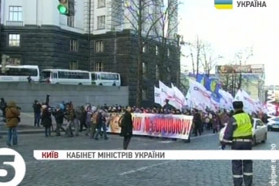 Близько п’яти сотень людей вимагають відновити підготовку до підписання Угоди про асоціацію та відставки уряду Миколи Азарова. Люди тримають в руках прапори опозиційних партій. Правоохоронців же, які пильнують порядок у кілька разів більше, ніж самих активістів. Перед присутніми вже виступили лідери опозиції. Вони наголосили, що акція мирна і попросили людей не піддаватись на провокації. Далі рушили до будівлі уряду. Втім їх усередину не пустили.