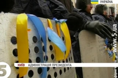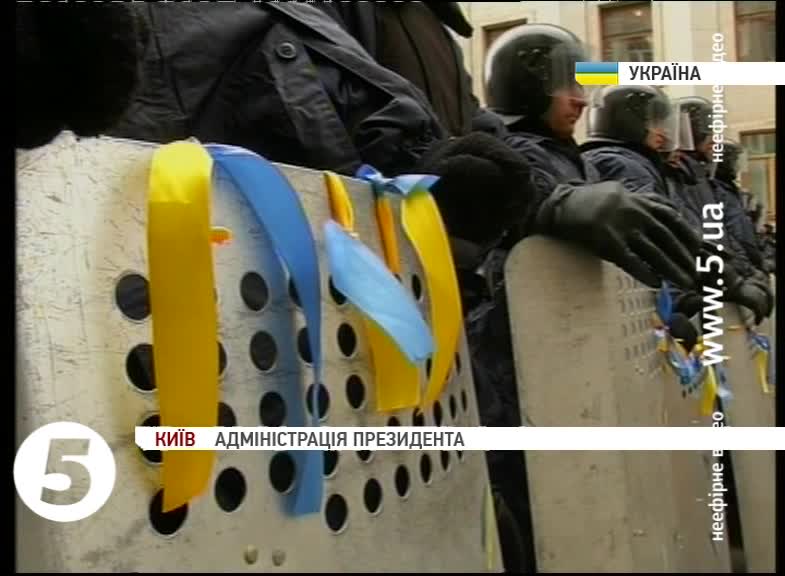 Вони почепили синьо-жовті стрічки на щити і розмалювали їх олівцями. У такий спосіб хотіли показати, що проводять мирну акцію. Більше активістів до адміністрації президента не пускають і закликають їх іти до будівлі Кабінету міністрів, адже саме там зараз відбувається мітинг.