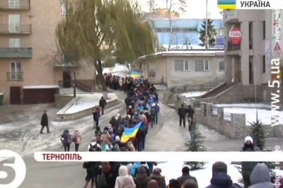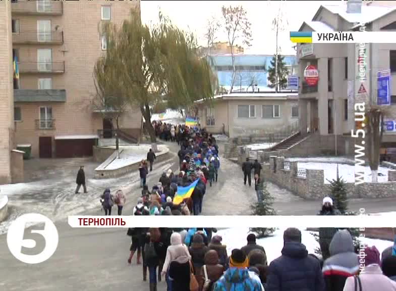 Супроводжували колону автомобілісти. Молоді люди несли прапори України та Євросоюзу, а також намагалися зігрітися вигуками «Хто стрибає – той в ЄС». На Євромайдані Тернополя сьогодні відбудуться загальні збори депутатів органів місцевого самоврядування, а також – масовий концерт, участь у якому візьмуть гурти Тернополя.