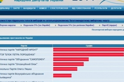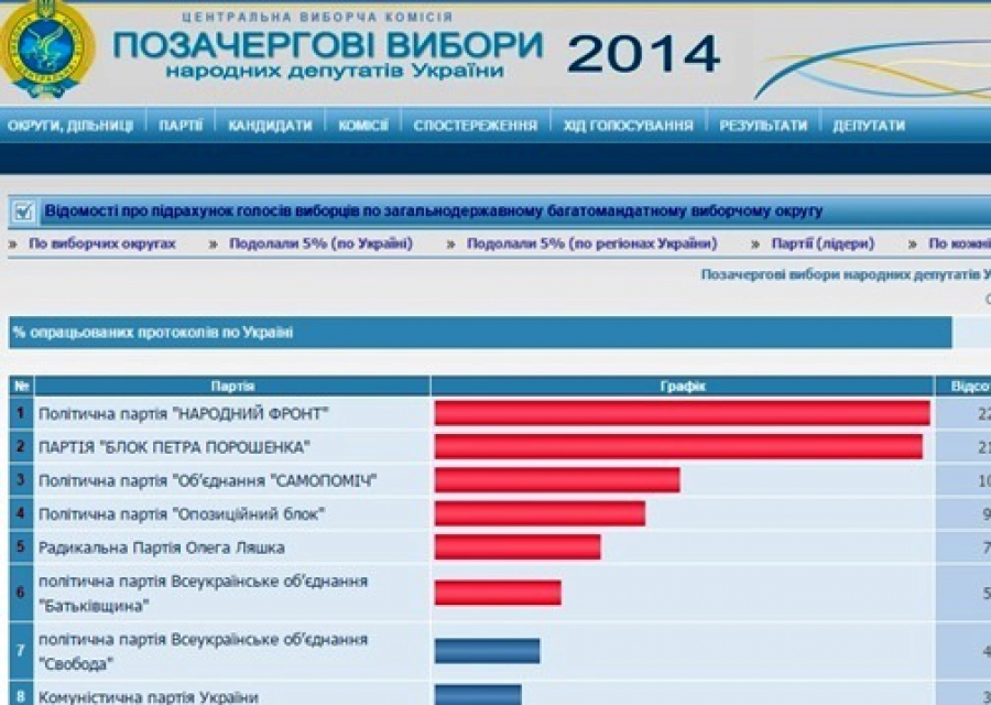 Згідно з даними, оприлюдненими ввечері 7 листопада на сайті Центральної виборчої комісії, за партію "Народний фронт" проголосували 22,14% виборців, за "Блок Петра Порошенко - 21,81%, за "Об'єднання "Самопоміч" - 10,97%, за "Опозиційний блок "- 9,43%, за Радикальну партію Олега Ляшка - 7,44%, за Всеукраїнське об'єднання "Батьківщина" - 5,58%.