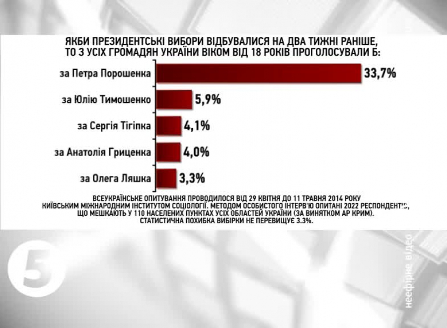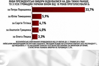 Якби президентські вибори відбулися на два тижні раніше, майже 34% усіх громадян України проголосували б за Петра Порошенка, близько 6% - за Юлію Тимошенко, 4% - за Сергія Тигіпка, стільки ж - за Анатолія Гриценка і трохи більше 3% - за Олега Ляшка. Решта кандидатів набрали б менше 3%.