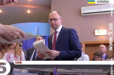 Голосував Арсеній Яценюк разом з дружиною на Печерську, у приміщенні “Київводоканалу”, який прикрасили синьо-жовтими бантами. Виборці на цій дільниці, яких з самого ранку дуже багато, також виглядають патріотично - у вишиванках.
