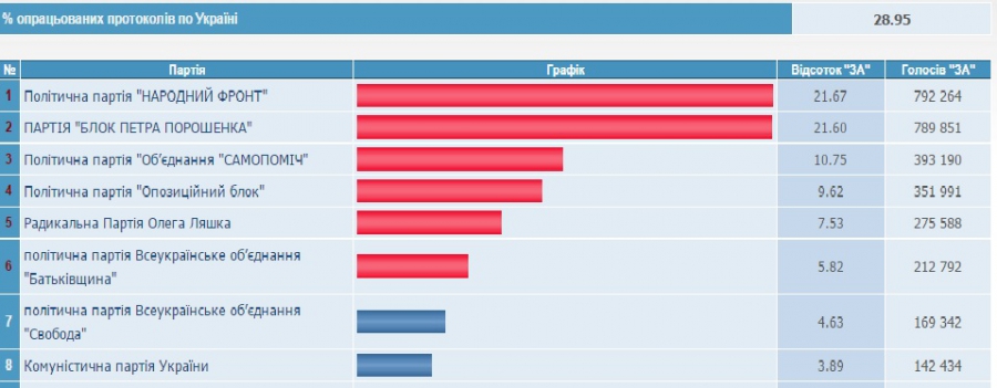 Згідно з даними ЦВК, поки що лідирує "Народний фронт", за який проголосувало 21.67% виборців. За ним іде "Блок Петра Порошенка", який набирає 21.60%.