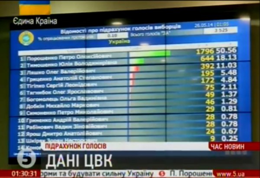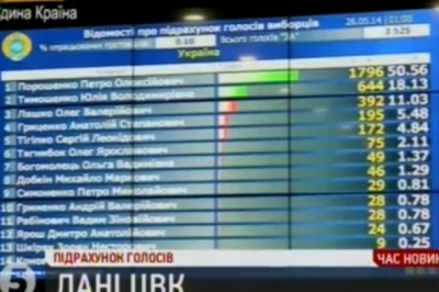 Згідно з даними обробки 100% протоколів в електронному вигляді, за Петра Порошенка віддали голоси 54,7% виборців.