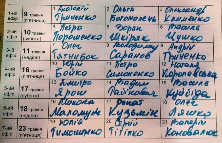 Порошенко буде виступати разом з Цушко та Шкіряком 10 травня. Тимошенко - в останній трійці, разом з Тигипко та Коновалюком - 23 травня.