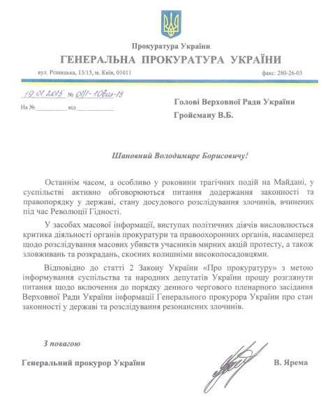 Як повідомила прес-служба ГПУ, Віталій Ярема хоче розповісти парламентарям про стан законності у державі та розслідування резонансних злочинів.