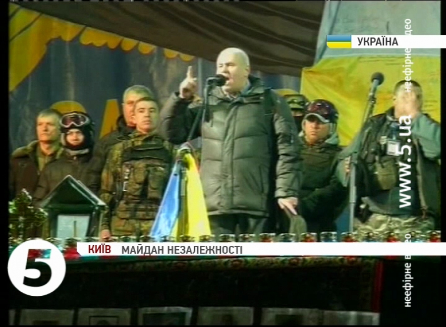 Микола Шваля, сотник Самооборони Майдану: «Повна люстрація людей, яких призначають на посади – це перша і сама основна вимога. Друга вимога – на протязі 5-ти робочих діб повинен бути арештований Янукович і його команда. Третя наша вимога була, що в Україні гарантовано повинно зупинитися переслідування по національних, релігійних признаках і підтримках політичних партій. Чекаємо до четверга. Якщо вони не можуть прийти до нас – ми прийдемо до них».