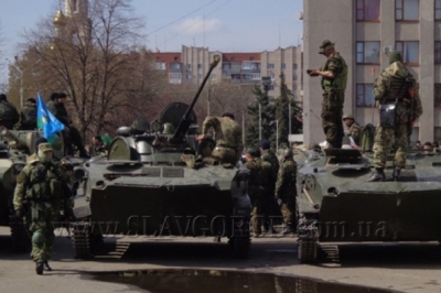 Станом на 15.00 16 квітня бронетехніка розташовується неподалік від однієї з адміністративних будівель в центрі Слов’янська. Поблизу неї перебувають озброєні особи у військових одностроях, які не мають відношення до Збройних Сил України.