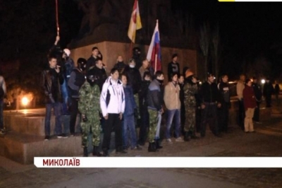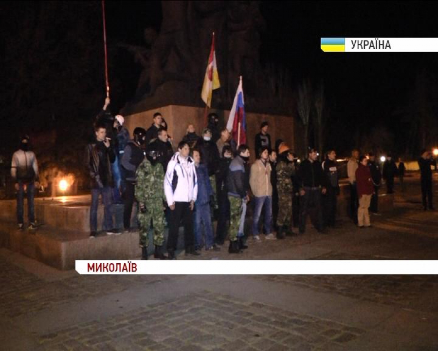 Вночі відбулась бійка і стрілянина між "Народним ополченням" Миколаєва, Самообороною місцевого Майдану з одного боку, і сепаратистами з іншого, які намагалися захопити будівлю Миколаївської облдержадміністрації. Під час зіткнень використовувалися шумові гранати, фаєри, петарди та пневматична зброя. Медики повідомляють про 15-х постраждалих під час сутичок поблизу пам'ятника героям-ольшанцям. Один чоловік ушпиталений з контузією – біля нього вибухнула потужна петарда.