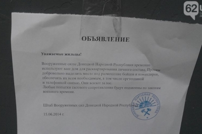 Згідно з повідомленням, у минулу суботу на ряді житлових будинків з'явилися оголошення, підписані "Штабом Збройних сил Донецької Народної Республіки". Як говориться в тексті оголошення, людей просять "добровільно виділити місце під розміщення бійців і командирів, забезпечити їх усім необхідним, у тому числі оргтехнікою та телефонним зв'язком".