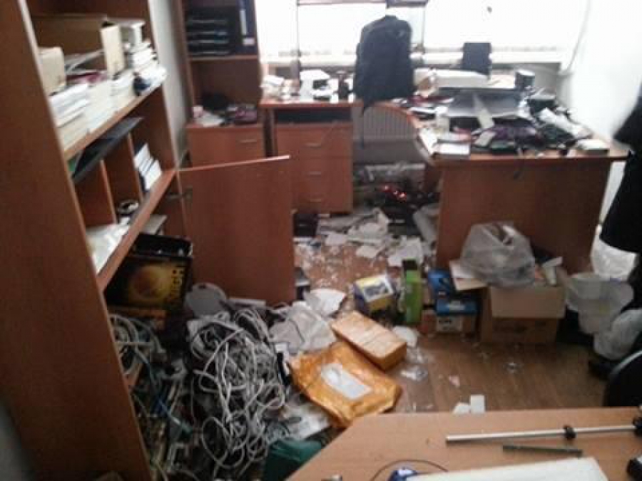За інформацією міліції, о 6.05 невідомі люди у масках з битами увірвалась у приміщення. При цьому якихось вимог вони не висунули. Потому група із чотирьох десятків людей почали барикадували вхід у будівлю. Проте за півтори години, після перемов, невідомі покинули приміщення. Черговий самозваний міністр оборони так званої Донецької Республіки – затриманий. На місці працює слідча група. Розміри збитків встановлюють.