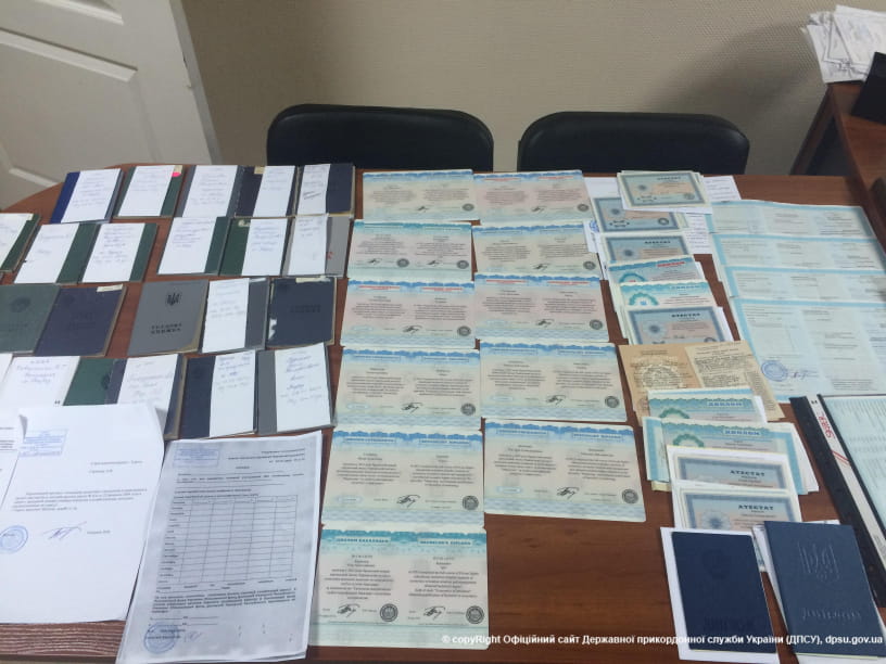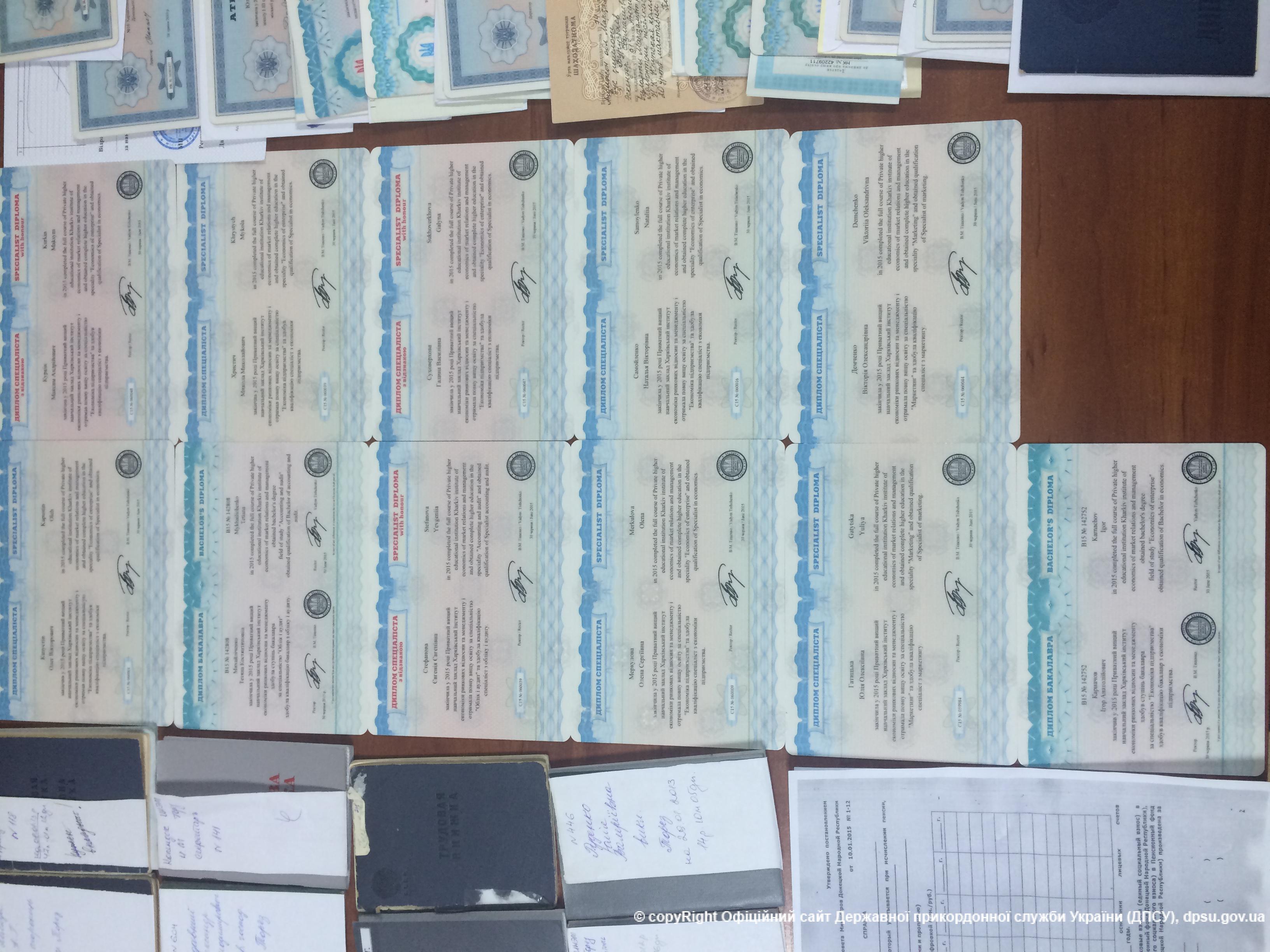 "Затримання відбулося в пункті пропуску для міжнародного сполучення "Гоптівка". Під час проходження паспортного контролю громадянка України, яка слідувала до РФ автобусом, помітно нервувала, чим і привернула до себе увагу правоохоронців. В подальшому, прикордонники спільно зі співробітниками митниці провели огляд особистих речей, серед яких знайшли близько 20 трудових книжок, 14 дипломів про вищу освіту Харківського приватного інституту та 9 чистих бланків довідок "ДНР" для нарахування пенсій з проставленими мастичними печатками. Для подальшої перевірки 52-річну мешканку Харківщини передали співробітникам СБУ", - поінформували у Держприкордонслужбі.