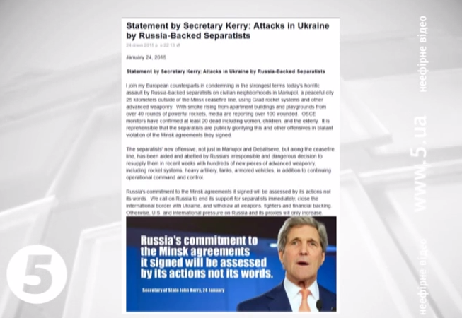 Сполучені Штати долучилися до заяв Євросоюзу, що засуджують напад на Маріуполь. Голова Держдепу Джон Керрі заявив: сепаратисти публічно вихваляються порушенням Мінских угод. Він зазначив, що їхньому просуванню сприяє безвідповідальна та небезпечна допомога із боку Росії. За словами Керрі, в останні тижні Москва надала бойовикам сотні одиниць сучасного озброєння. Якщо так триватиме і надалі - застеріг голова Держдепу - США та союзники збільшать тиск на Росію.