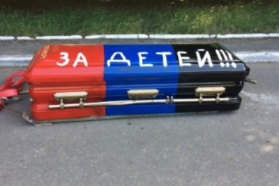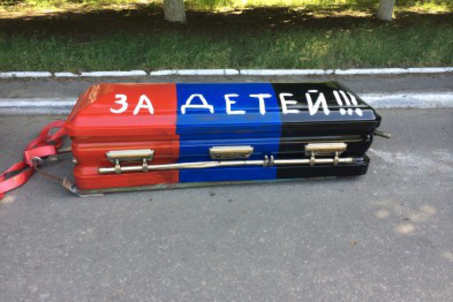 "Таким чином, прикрасивши домовину в кольори прапора "ДНР", ми вирішили відреагувати на погрози від представників республіки на адресу наших сімей і дітей", - зазначив один із власників служби ритуальних послуг Микола Сапаров і додав , що на одній стороні труни було написано "За дітей", а на іншій - "Геть з міста".