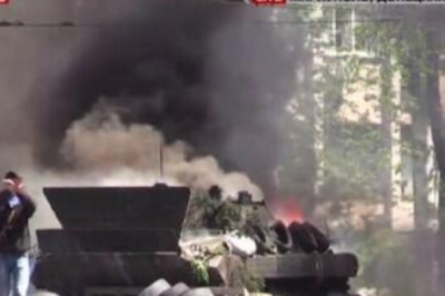 Біля міськради Маріуполя запалили шини. Чути постріли з автоматичної зброї, терористи також стріляли із гармати захопленого напередодні БМП. Наразі до будівлі міської ради їдуть пожежні машини.