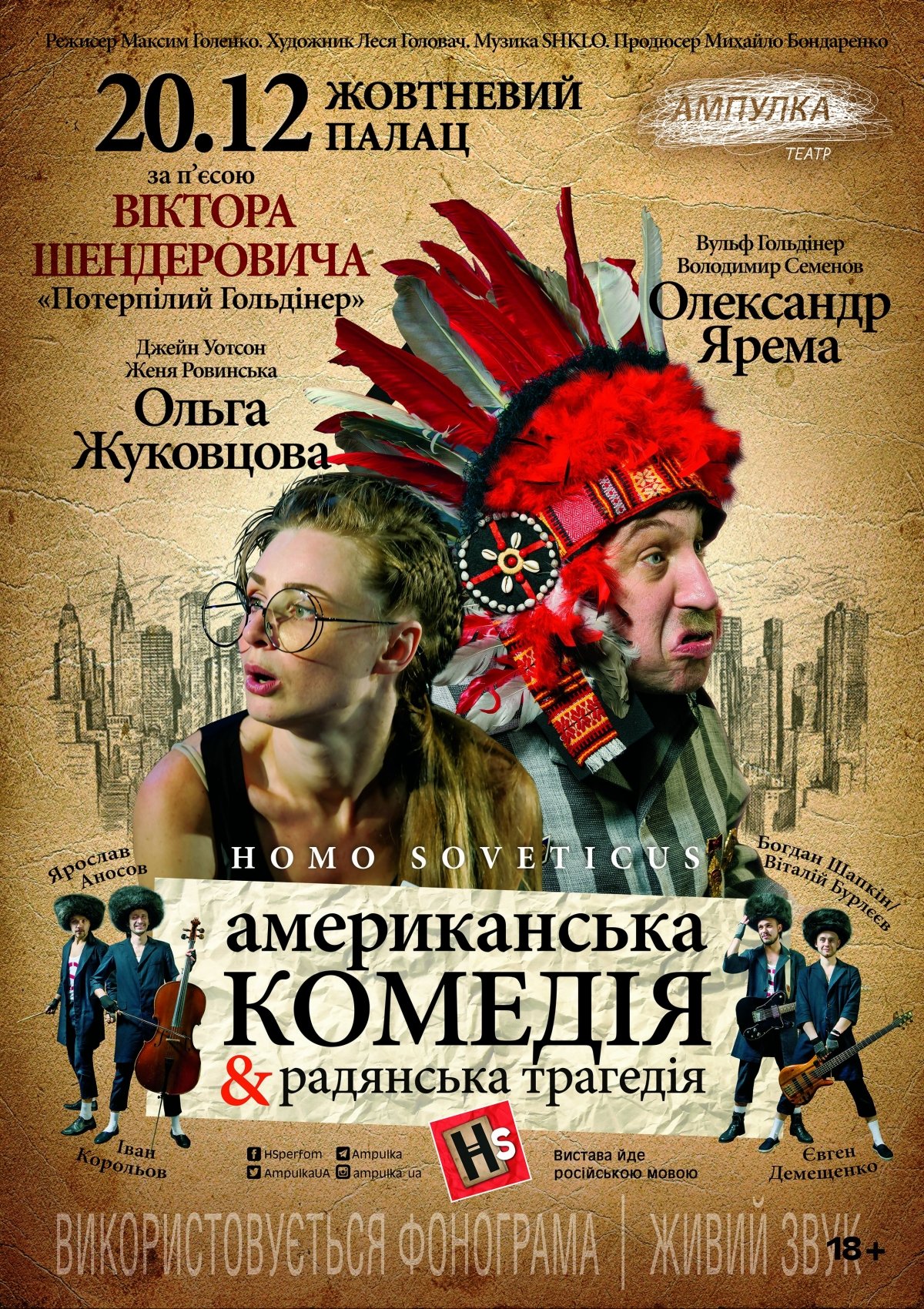 "Американська комедія & радянська трагедія" або HS за п'єсою Віктора Шендеровича "Потерпілий Гольдінер". Продюсер Михайло Бондаренко запросив на постановку найбільш затребуваних і талановитих людей сучасного українського театру.