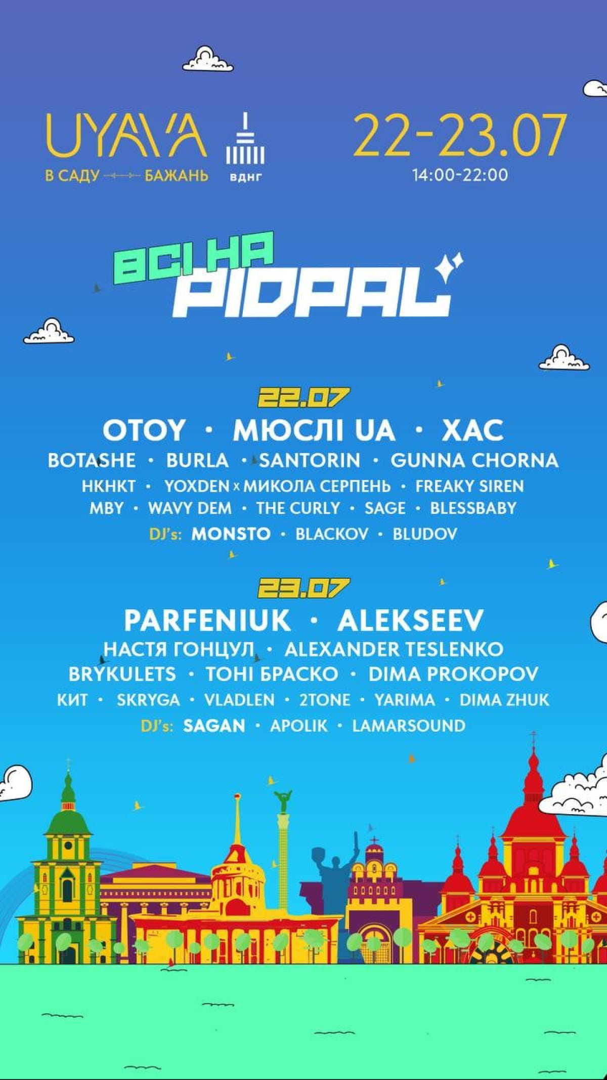 22 і 23 липня артпростір Uyava на ВДНГ запрошує всіх на PIDPAL, запалювати просто неба будуть топові молоді українські хіп-хоп та попмузиканти – OTOY, Мюслі UA, ХАС, ALEKSEEV і багато інших.