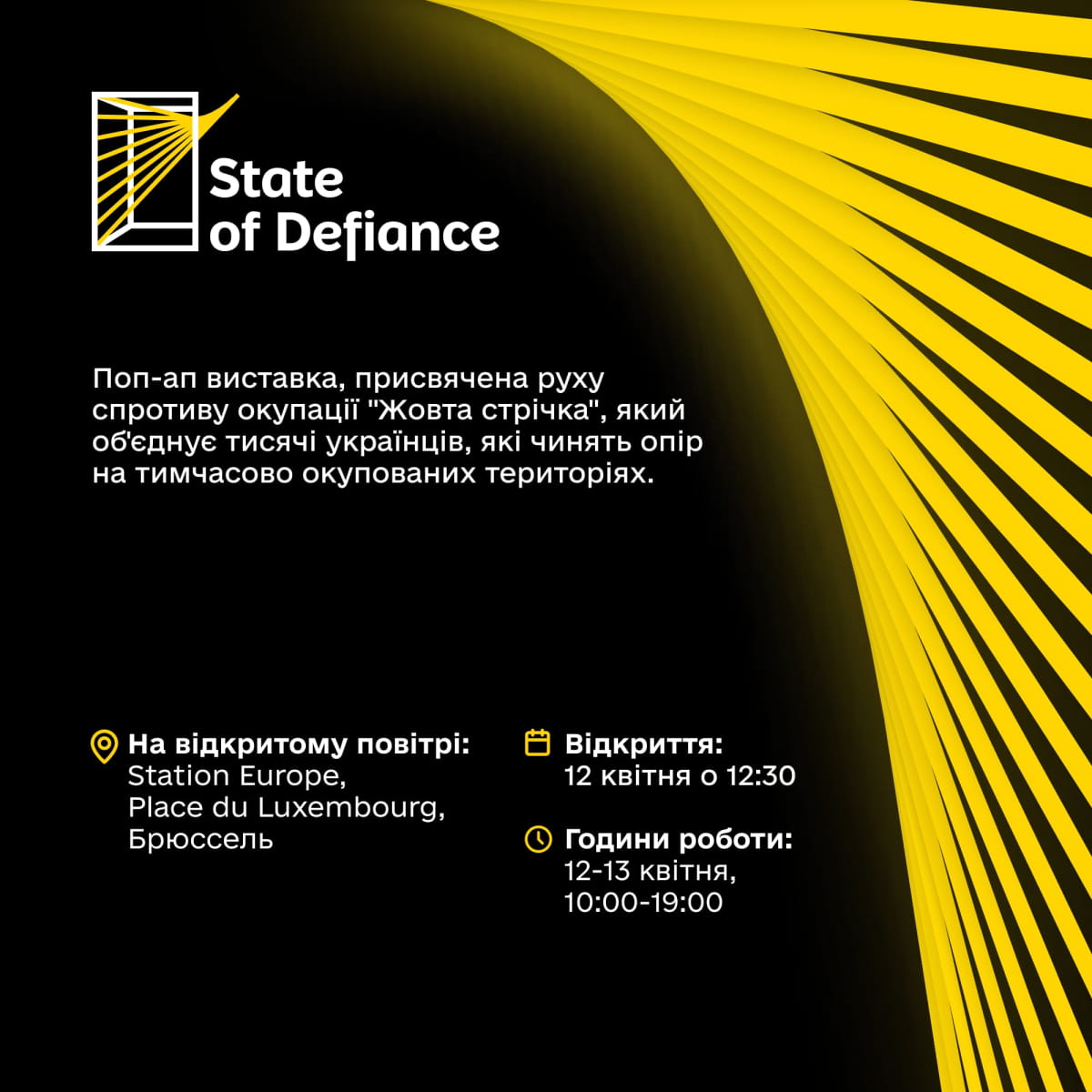 12-13 квітня на Площі Люксембург (Place du Luxembourg) біля Station Europe поруч із Європейським парламентом у Брюсселі відбудеться поп-ап виставка State of Defiance. Її ініціює рух громадського спротиву "Жовта стрічка", щоб розповісти європейцям про стійкість та опір українців на тимчасово окупованих росією територіях.
