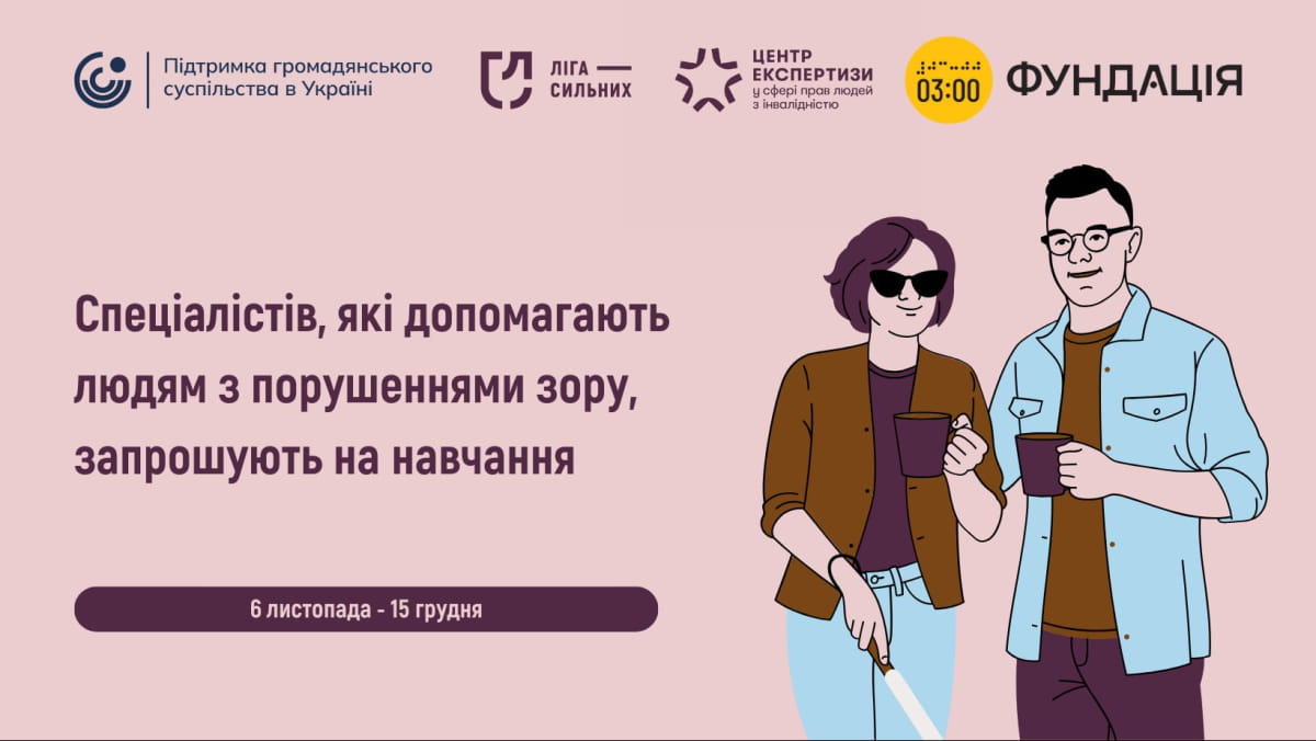 Громадська спілка "Ліга Сильних" спільно з благодійним фондом "Фундація 03:00" оголошують перший набір на курс "Основи адаптації людей із порушеннями зору". Навчання відбудеться в рамках реалізації проєкту "Центр експертизи у сфері прав людей з інвалідністю". Про це повідомила виконавча директорка громадської спілки "Ліга Сильних" Дар'я Сидоренко.