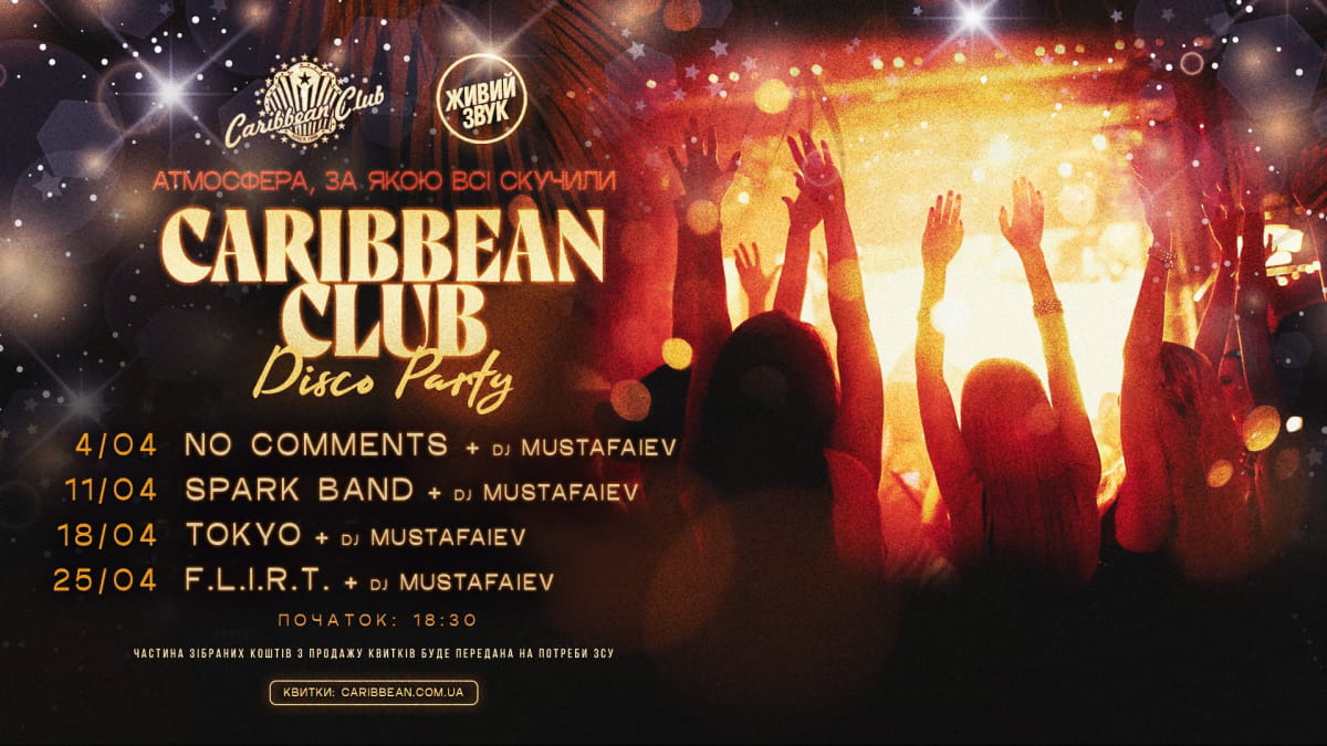 У квітні на сцені – NO COMMENTS, SPARK Band, TOKYO та F.L.I.R.T. Вони переосмислюють популярні треки в драйвових концертних версіях, а між виступами ритм вечора підтримує DJ Mustafaev.