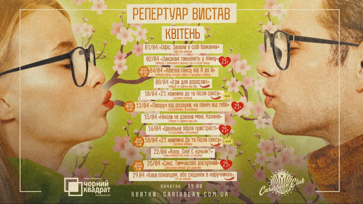 У квітні на сцені – постановки театру "Чорний Квадрат", який працює із жанром сучасної комедії про стосунки та повсякденні ситуації.