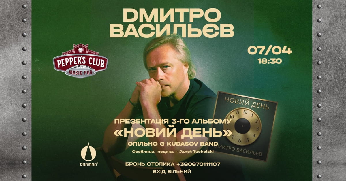 Цього вечора нову концертну програму представить Dмитро Васильєв – політолог, який паралельно ще й займається музикою. У Pepper's він презентує третій альбом "Новий День" у супроводі Kudasov Band.