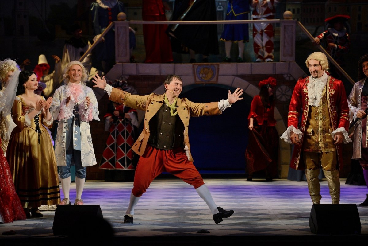В Національній опереті 4 квітня о 19:00 буде покажуть мюзикл "Труффальдіно із Бергамо" за мотивами п'єси італійського драматурга Карла Гольдоні "Слуга двох панів", написаної 1749 року у жанрі комедії дель арте.