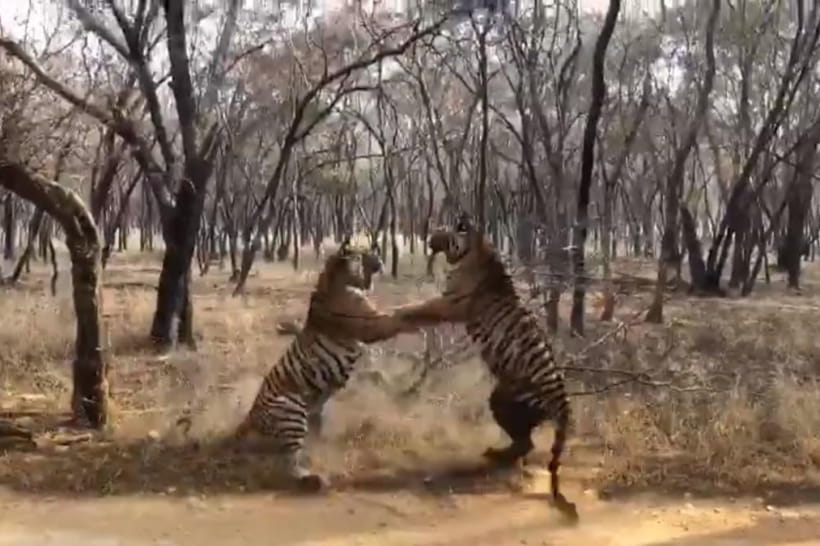 Два індійських тигри зчепилися у видовищній бійці, яку користувачі мережі назвали "битвою титанів". Ролик сутички виклав офіцер індійської лісової служби Парвін Касван у Twitter.