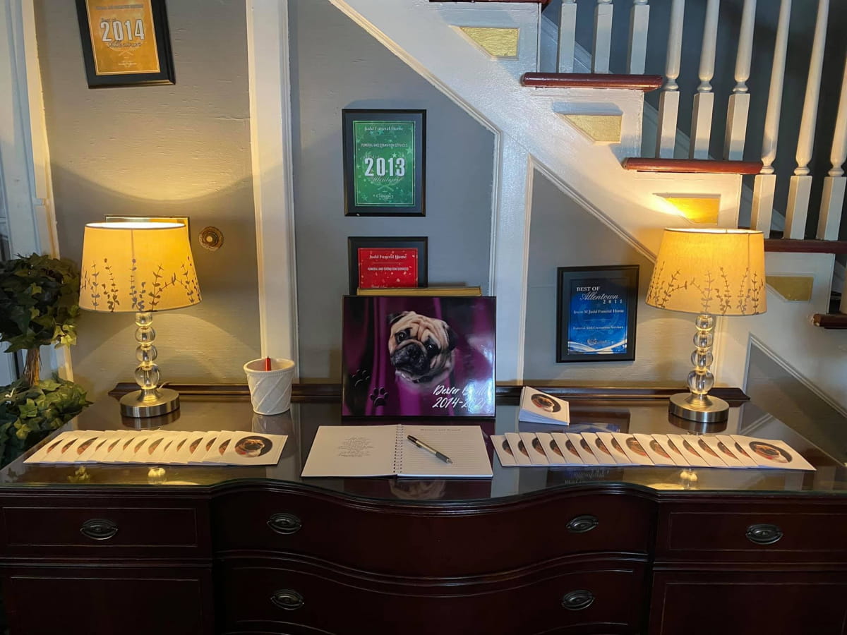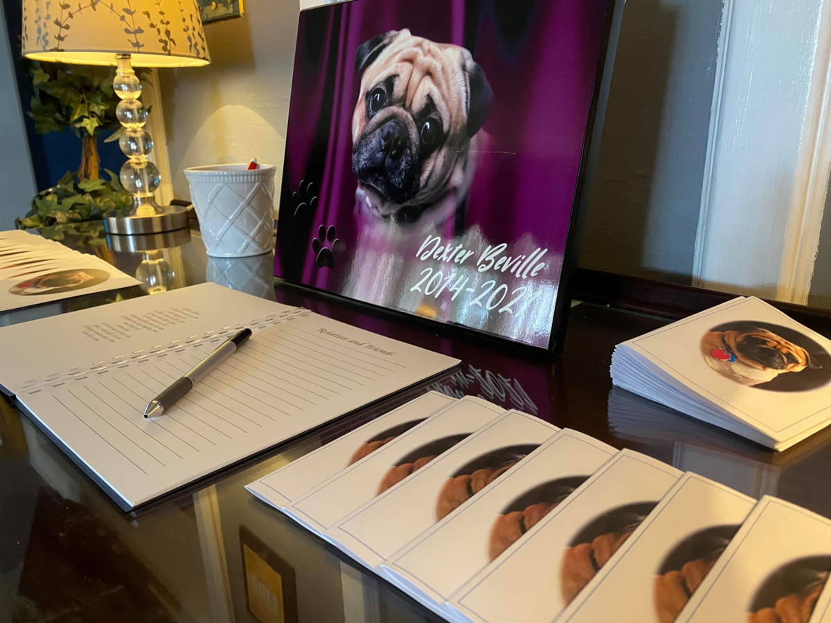 На покійного одягли синю краватку-метелик, а під голову собаки поклали його улюблену іграшку. У похоронному залі розмістили книгу реєстрації для учасників заходу, а також невелику програмку, на останній сторінці якої було зображено господаря з твариною, які дивляться один одному в очі.