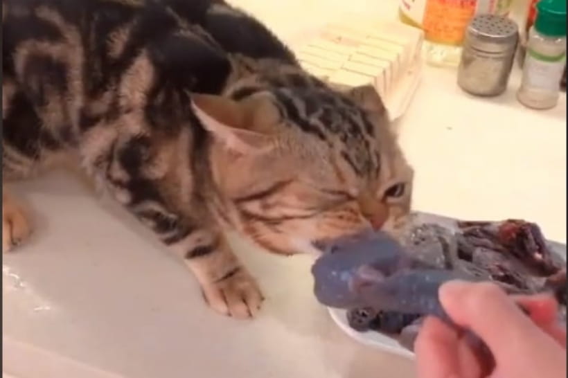 На відео помітно, що люди намагаються спокійно поїсти чи зайнятися готуванням продуктів, але кіт постійно міцно хапає їжу. Найбільше його увагу привертає м'ясо та морепродукти, але також він не відмовляється від фруктів і овочів.