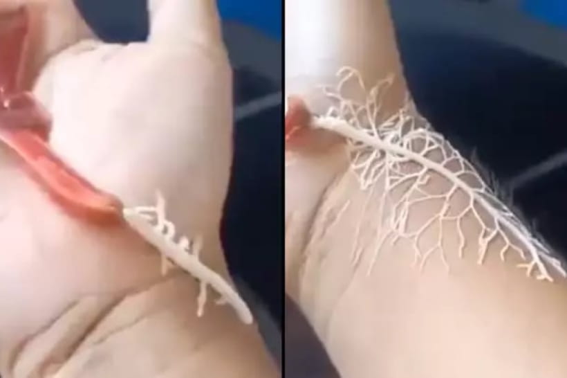 На опублікованих фото помітно, що у чоловіка по руці повзає червоний хробак. Істота рухається та виділяє павутиння, яке нагадує коріння.