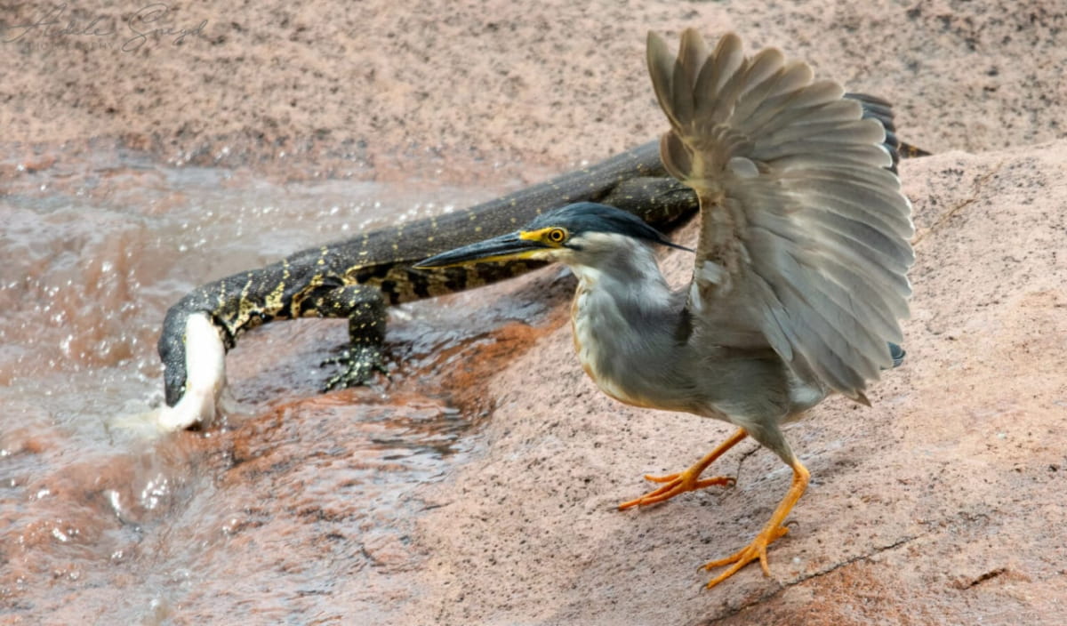 Чапля та ящірка кинулися назустріч своїй здобичі. Птах помітив швидкість і розмір свого суперника, а тому вирішив відступити. Водночас рептилія намагалася швидко схопити рибу, але марно.
