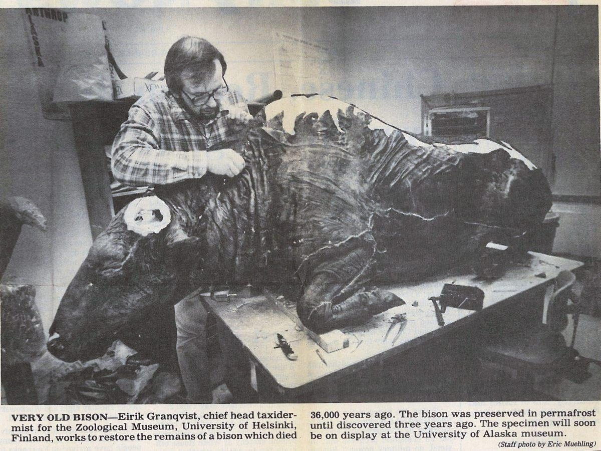 У 1984 році знахідка отримала несподіваний розвиток. Палеонтолог Дейл Гатрі з Університету Аляски у Фербанксі, який очолював розкопки, вирішив відзначити завершення реставрації туші незвичайним способом. Після того, як фінський таксидерміст Ейрік Гранквіст завершив роботу над зразком, Гатрі організував вечерю, приготувавши рагу з невеликої частини шиї Синього Малюка.