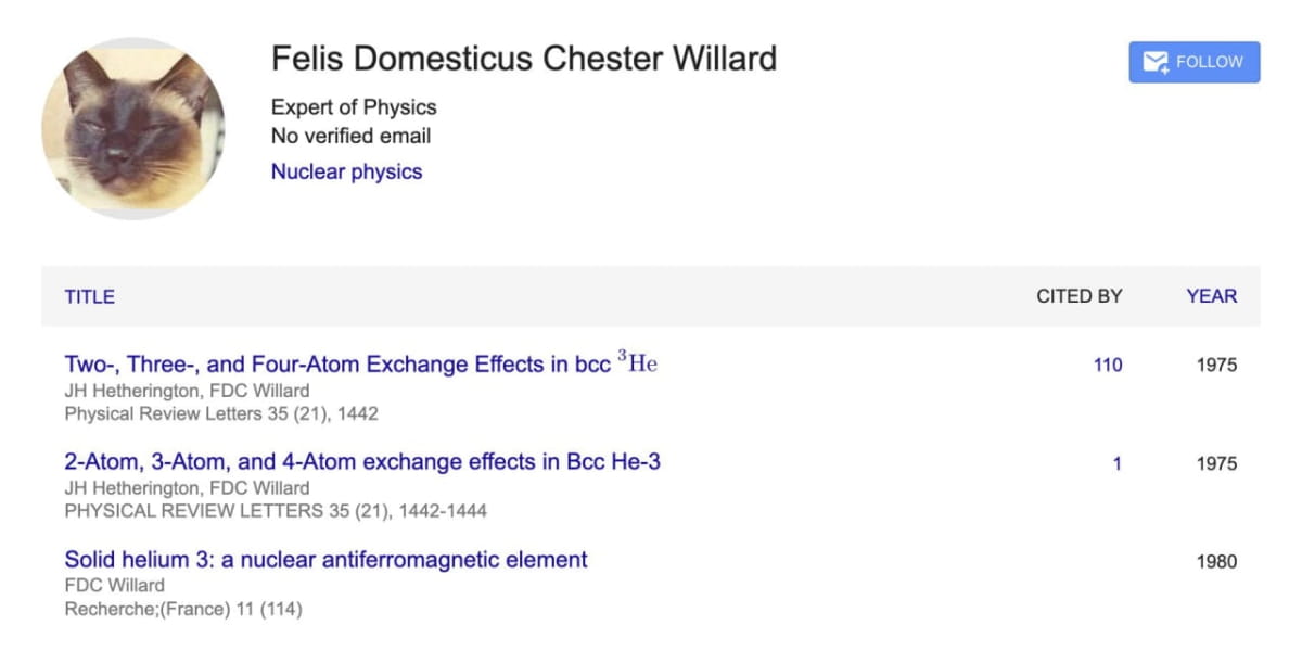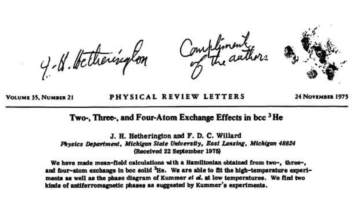 Так на світ з'явився фізик Ф. Д. Ч. Віллард. Стаття під назвою "Two–, Three–, and Four–Atom Exchange Effects in bcc ³He" була успішно опублікована в листопаді 1975 року.