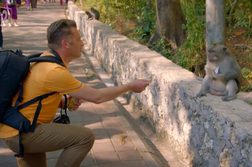 Пекем провів експеримент, зобразивши необачного туриста, - одна з мавп моментально підбігла до нього і забрала iPhone. Після цього примат і ведучий почали торгуватися: спочатку Пекем запропонував мавпі горіхи і банани, але її це не влаштувало. iPhone вона погодилася віддати тільки в обмін на яйця.