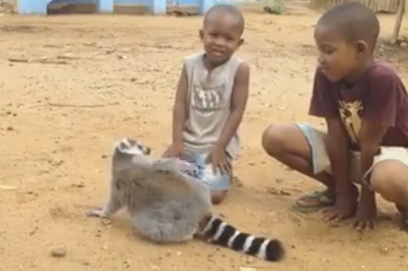 На відео видно, як діти чухають спину лемуру, але коли вони зупиняються, лемур починає плескати себе по спині, мовляв, давайте продовжуйте.