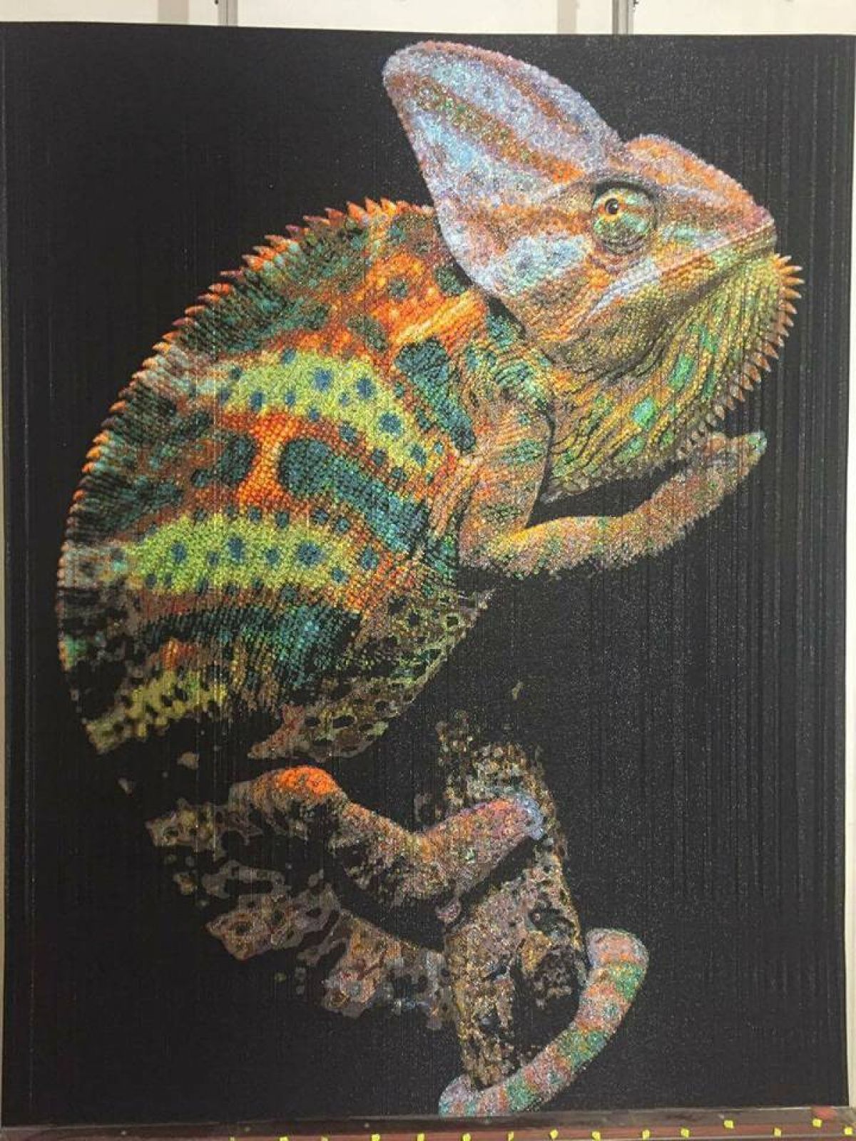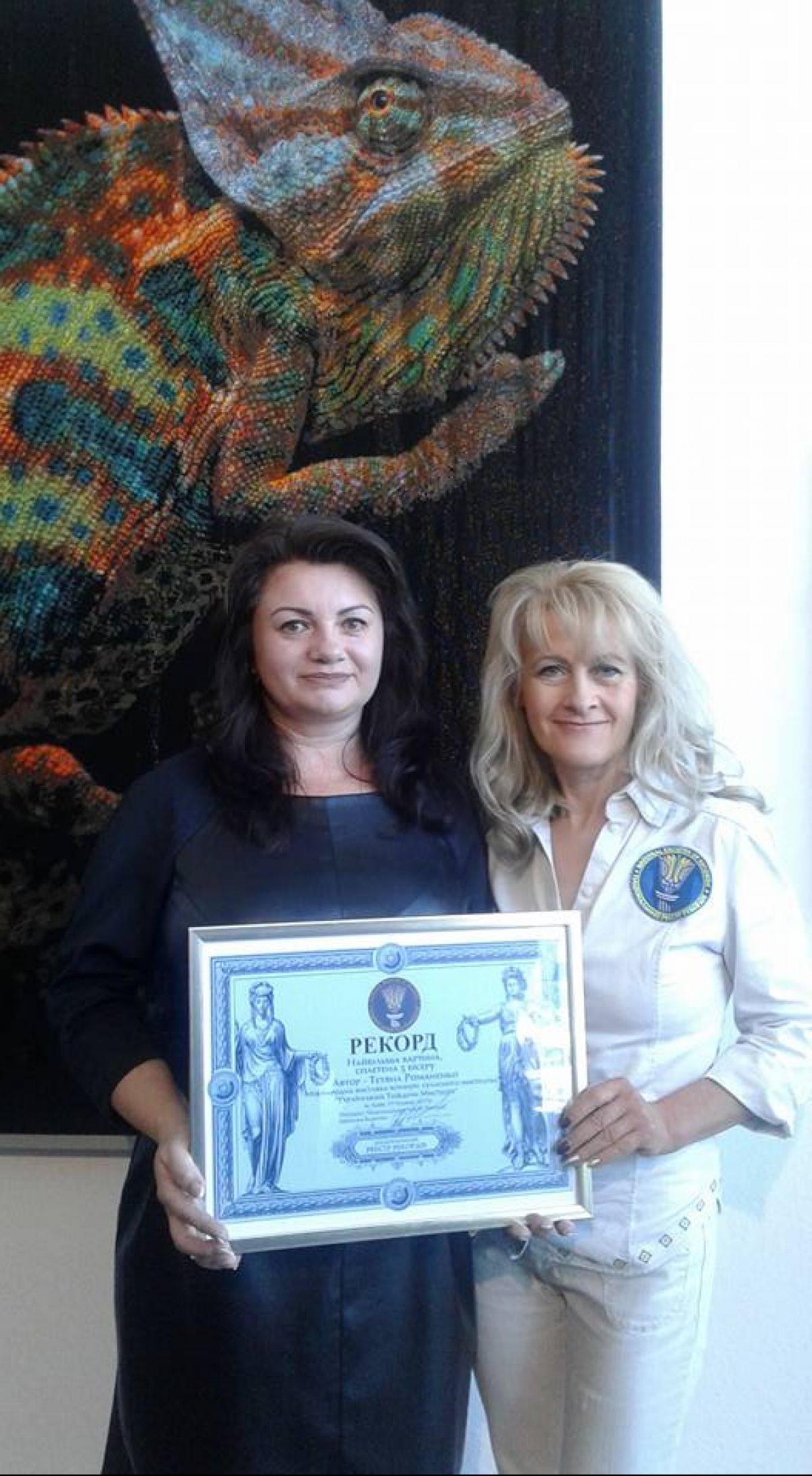 "Для створення своєї грандіозної картини "Хамелеон" майстриня Тетяна Романенко використала 748 відтінків кольорів бісеру! Таке враження, що її Хамелеон живий і змінює своє забарвлення в залежності від ракурсу погляду на нього. Робота визнана рекордом і внесена до Національного реєстру рекордів України", – йдеться в повідомленні.