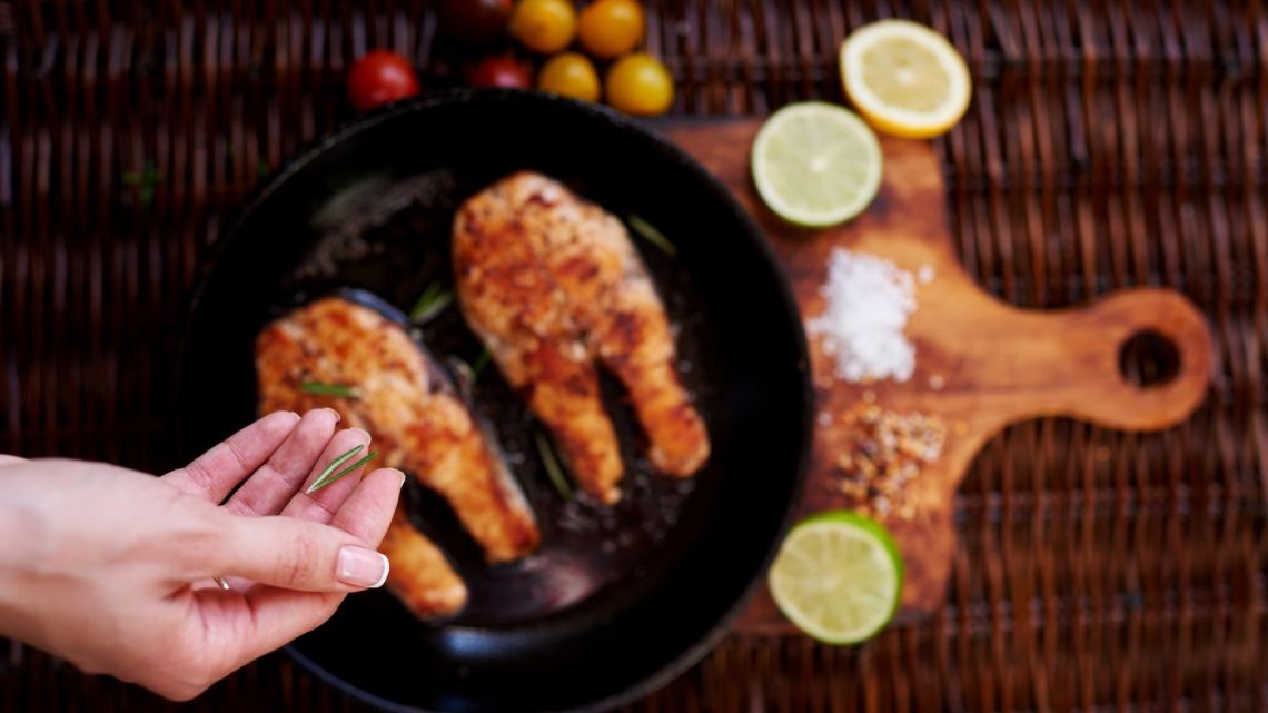 - Рибу очистити від луски, випатрати, промити, обсушити паперовими рушниками, натерти сіллю, перцем і сушеними травами.