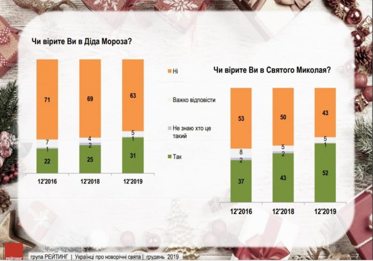 Половина українців сказали, що вірять у Миколая, тоді як у Діда Мороза вірить 31% опитуваних.